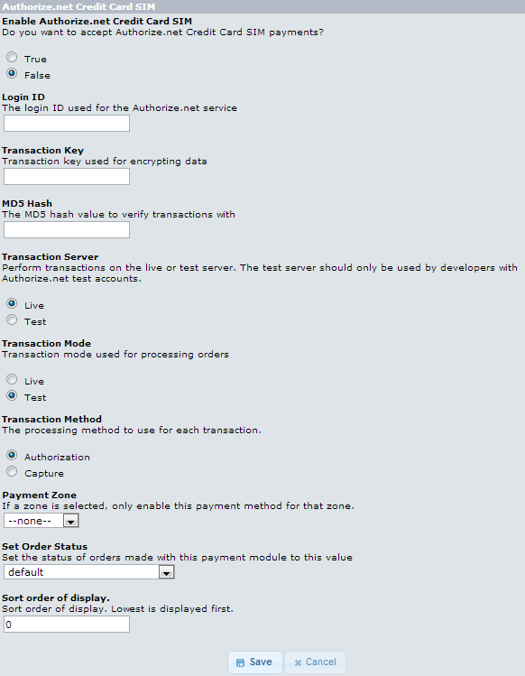 | Enable Authorize.net Credit Card SIM | True enables, this shipping option. If you select False, this shipping option will not be available. |