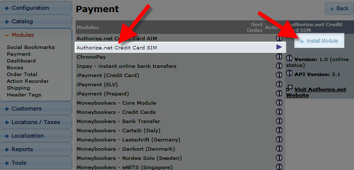 In this tutorial we will show you how to add the Authorize.net payment option to your osCommerce eShop. As we guide you through the Authorize.net setup process in osCommerce, we will first install the Authorize.net Credit Card SIM module, then edit the available settings.