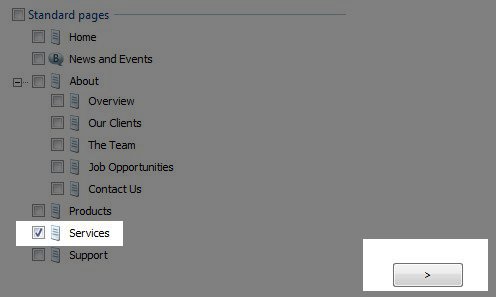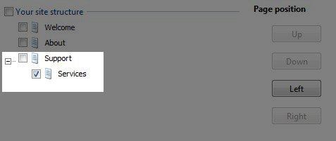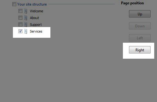 Once we've added the new page to our site structure, we will want to make sure it is listed immediately after the page that will be it's parent page. In this example, Services is listed just after Support (the page we want as the "parent" page) so we can now make it a second level page by selecting Services in the Site Structure and clicking on the button labeled "Right."