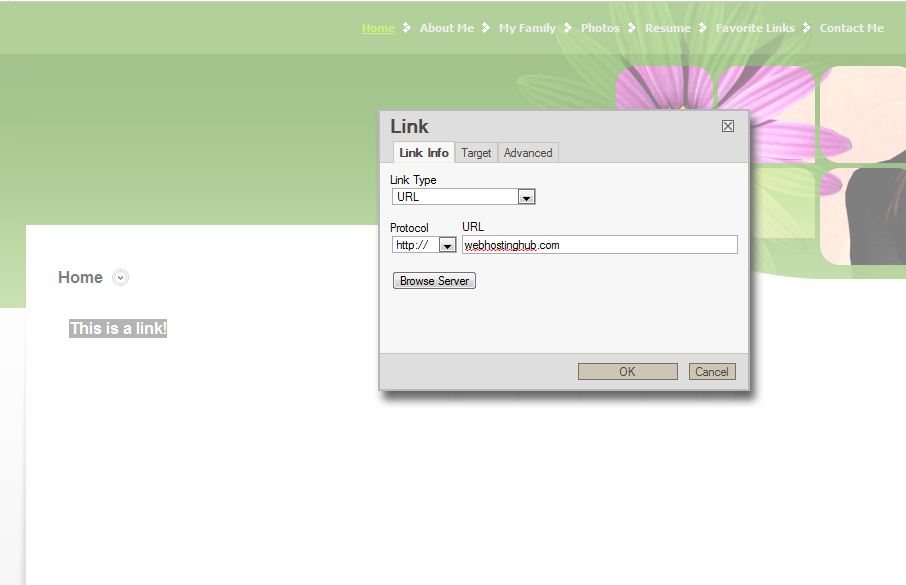 Once that is clicked on, a box will pop up. In the box, under URL put in the website that you want the link to direct to. In this case, I have directed the link to webhostinghub.com:
