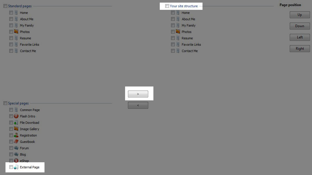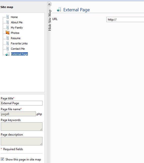 This will bring you back to your Edit Pages section, and you will see External Page on the left column under Site Map. Select it, and you will see this screen: