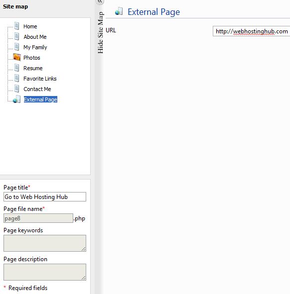 On this page, all you need to do is put in the URL that you want the link to direct to. In this example, I have used webhostinghub.com. Be sure to rename the title of the link from "External Page" to something more appropriate.