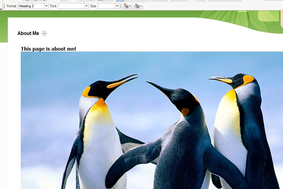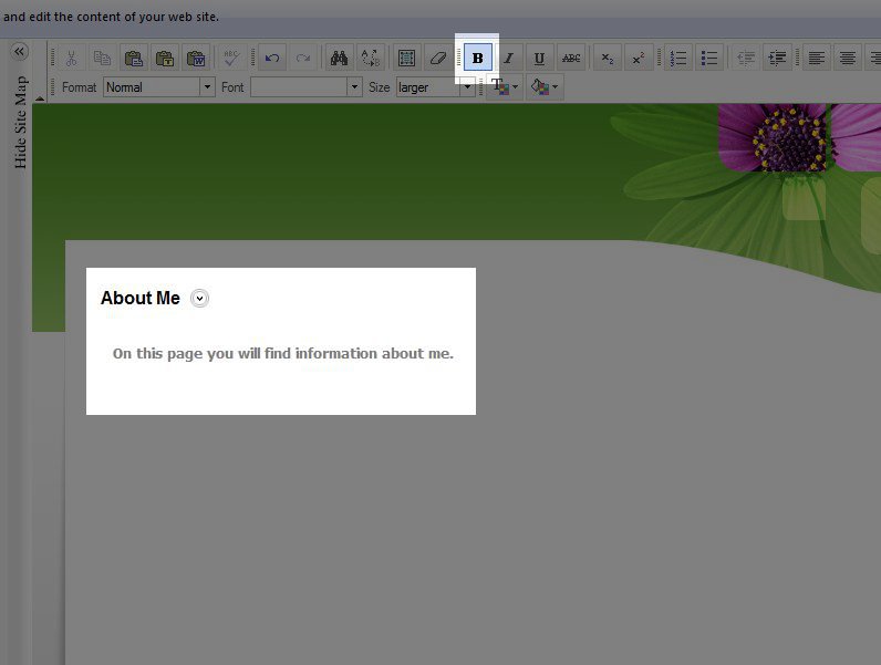 Now you can type any text that you want on the page, for this example I have highlighted the default text and replaced it with "On this page you will find information about me." You can also style your text as bold, italics, uncerline, etc. and even change the font by using the tool bar options above the content editing area.