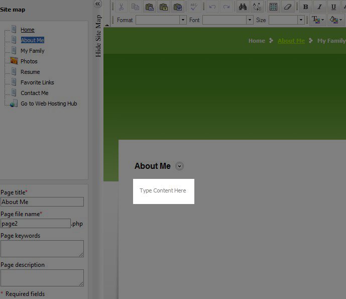 Once you are on the Edit section of the Premium Web Builder, you can add text, images, and more to your website. Since text and images are the most frequently added content, we will go over these two content items first. First, on the Site map on the left click on the page that you will want to edit. In this example, we will be editing the "About Me" page. By default, each page will say "Type Content Here":