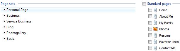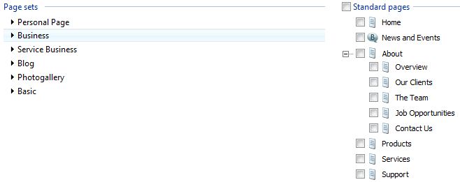 Page Sets give an example of different pages you might want to add to your website depending on the type of site you are developing. For example, under the Business page set, it has business-related page suggestions. When you select a page set, you will see the Standard pages change. Note that you do not have to chose all the pages from the page sets, and you can add different pages from different page sets. They are only there to assist you in finding the pages that you will want to add on your site.