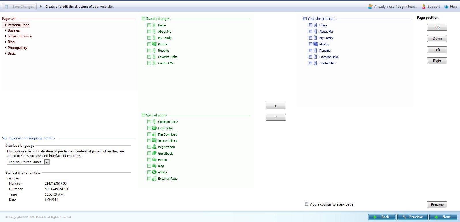 The Pages section is split into three parts: Page sets, Standard/Special pages, and Your site structure.