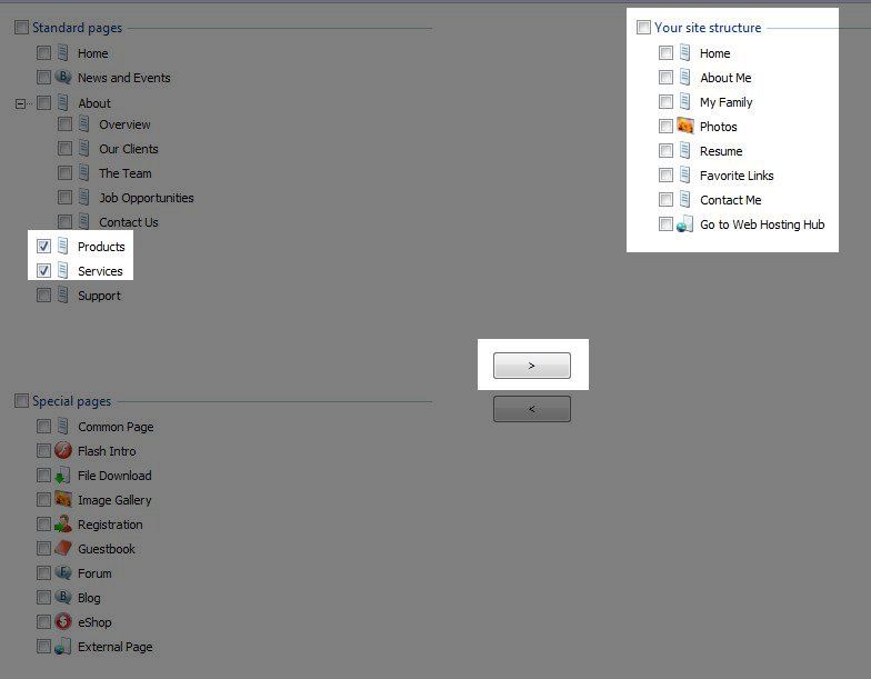 Once a page set is selected, under Standard pages will be a list of pages that is recommended for that page set. Also, the Special pages will always be available as well. Please remember that some pages are automatically on your site (they can be seen under "Your site structure"), so be sure not to add pages that are already on your website by default. Once you have found a page that you want to use on your site: