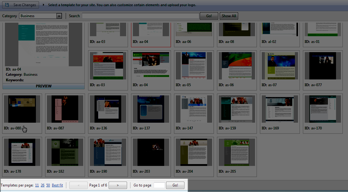 Once you found a template that you like, click on it to chose the theme as your template. Once it is clicked on, you can hit the PREVIEW button to see what your site will look like with that template. If you are satisifed with your template selection, click on Save Changes on the top left side of the page.