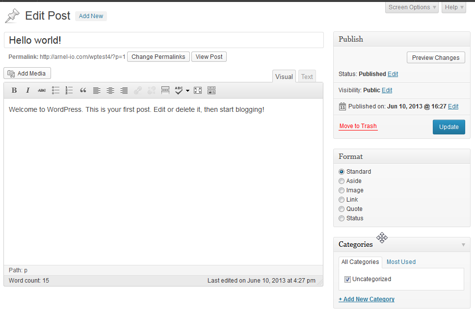 After you have a title, go to the next part of the form and you can add the body of the text for your post here. The editor has a button for adding media above the editor that is labeled Add Media. If you wish to add an image/graphic, then click on this button and then select your media or follow the directions provided to upload a picture to use. You do not need to know code here, though you can switch to the TEXT view by simply clicking on the TEXT tab at the top right of the editor. Stay on the VISUAL tab in order to use the WYSIWYG(What-You-See-Is-What-You-Get) editor.If this is your first blog, you will notice that this is a very quick way to build a website since much of the work is already done for you. You would primarily need to worry about adding the content and managing the appearance of the site.