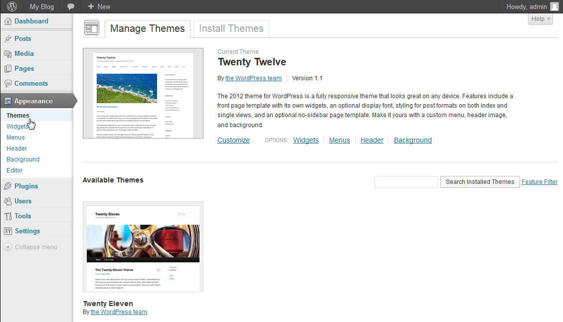 When you use WordPress in order to determine the appearance of your blog, you need to decide on a theme. To make this simple we are going to use the default theme that is loaded upon the installation of WordPress. If you want to see your site as it is now, you can view it by going to the tool bar with the WordPress symbol at the top of the screen and then hover over the domain name you used when installing the server (it should be to the right of the WordPress logo). You will then see a menu drop-down with the option to "visit site". Click on Visit Site and you will see the basic site before you do anything to it.