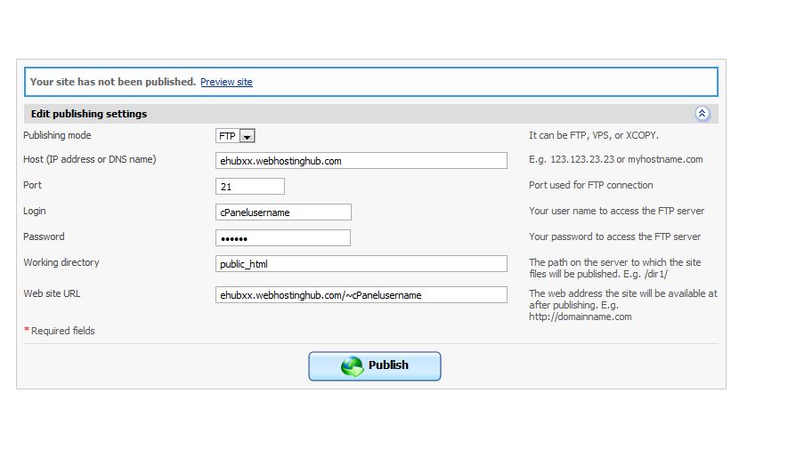 Once you are ready to publish your website, click on the Publish button at the top right side of the screen. Since this is your first time publishing, you will have a screen similar to this one with your account information: