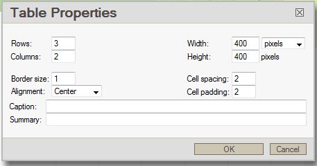Once you have selected the tables option, a new box will appear. This is where you will decide what size table that you want, and if you want the table to have a border. Once you have chosen the size and style of your table, click the "OK" button: