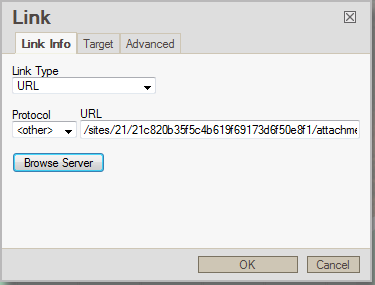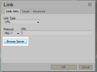 This brings you to a link properties box. You should notice a Browse Serverbutton on the first tab. Click that to continue.
