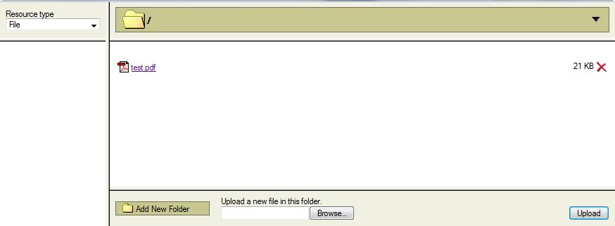 After uploading, the file will appear in the upper right panel of the server browser screen. The file name is designed as a link, so clicking on the file's name will cause it to automatically format and insert the data into the link editor popup.