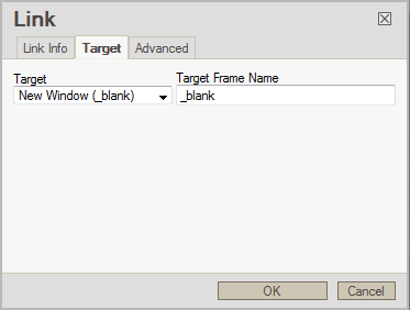 This step is not mandatory, but very common. Many times you want the link to open in another tab so the visitor still has your original site page open. To do this, click on the Target tab, then select New Window (_blank) from the dropdown menu. Click the OKbutton to save the information on all tabs and return you to the edit screen.