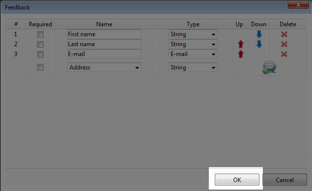 The following screen will appear, which will allow you to chose what fields your visitor will fill out on the form. Under Name will be the name seen by your visitors, and Type specifies the type of response your visitors can leave. For example, "String" means a string of text that the visitor can enter, while E-mail means they will enter an email address. Once you have put in all the fields you would like, click "OK."