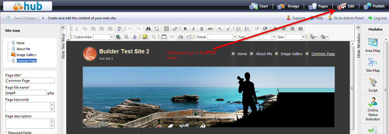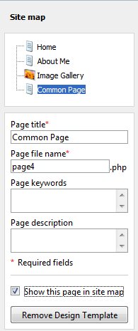 In the site map on the lefthand portion of the screen, click on the page that you wish to remove. In the example screenshot, the page being removed is the 'Common Page'.