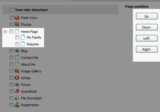 In this example, I have moved the My Family and the Resume pages to be subpages of the Home Page. A subpage can be used if you want to have more then one page under a category. For example, if you have "Meet the Team" page, you can make it so that each of your team members has a subpage within that section. To do this, check the boxes you want to make a subpage and under Page position (highlighted above) select "Right." To make a page no longer a subpage, you would select "Left." To move the page farther down the menu, check the page and click on "Down." To move the page farther up the menu, click "Up." Note that there can not be a subpage of a subpage, so each page is only able to be moved "Right" once.