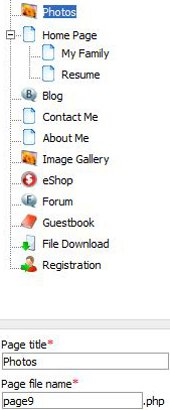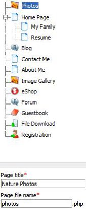 The picture on the left is the default, with the Page title of "Photos" and the Page file name as "page9." Here I have changed the Page title to "Nature Photos," which is unique and more descriptive, and changed the file name to "photos" so that when someone visits my website in the browser it will show www.mydomain.com/photos.php instead of /page9.php. Click save, and now the menu looks like this: