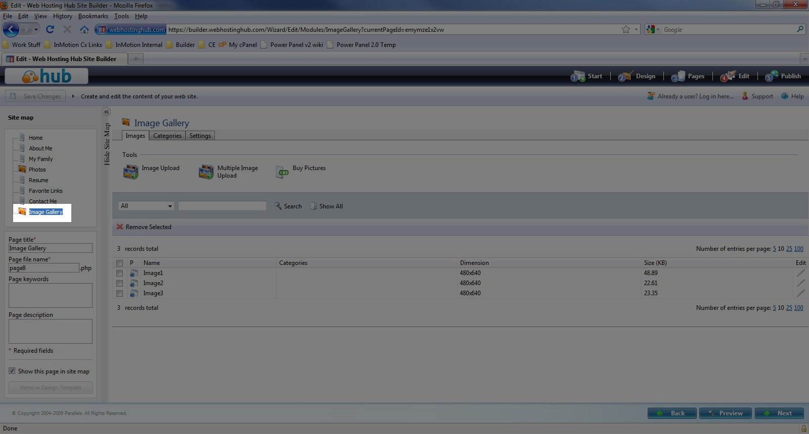 After clicking Next, you will be on the 4. Edit section of the Premium Web Builder. Under "Site map" click on "Image Gallery," and you are now ready to edit your Image Gallery by adding pictures.