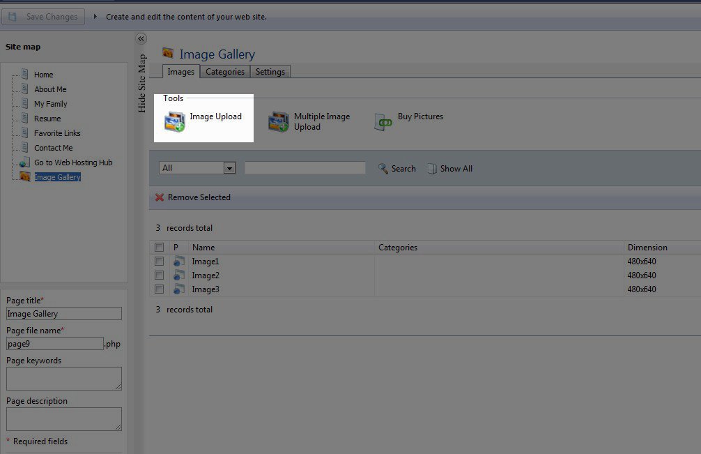 When you open the Image Gallery page under the Edit section of the Premium Web Builder, by default there are three images already loaded, but you will want to upload your own images. First, click on the "Image Upload" button under "Tools":
