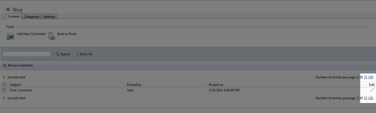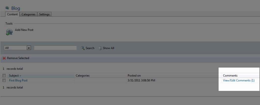 On this screen you will see any comments made on your blog post. If you do have a comment, you can modify it by clicking on the Pencil icon under the "Edit" header.