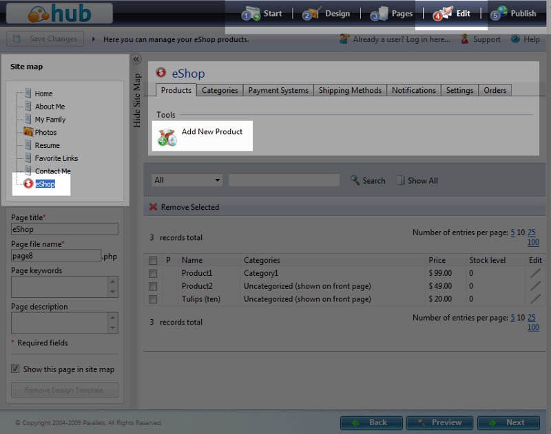 After you have added the special page eShop to your site, it's now time to begin adding products. If you have not already, log into your Premium Builder, and access "step 4 - Pages". In order to return to the previous course, please click on How to add an online store - eShop.
