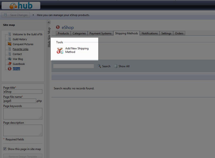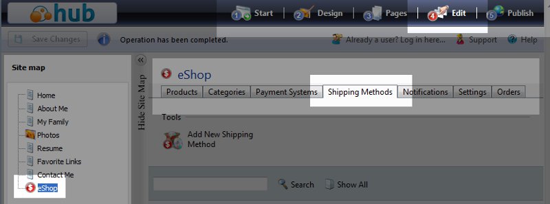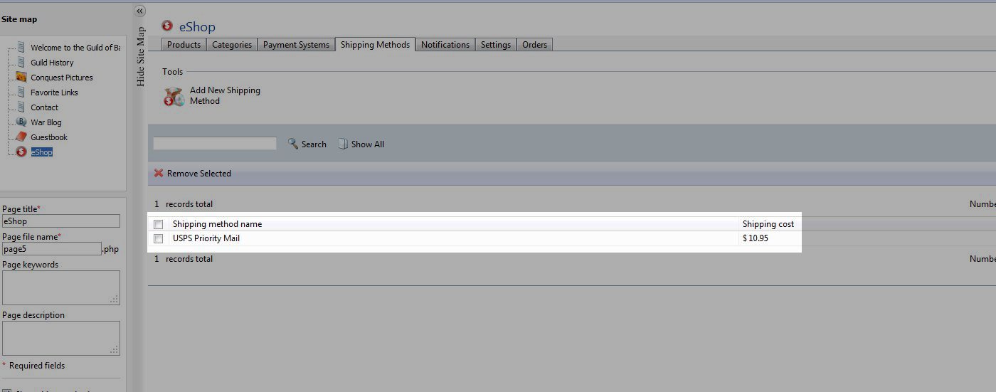 Within eShop, you can configure mulitple shipping options for your customers to be added to the order total. Each shipping option that you add is a flat rate. If you don't add any shipping methods, it will not be displayed at checkout time. In order to see a summary of the courses in this class, please go to 203: Setting up an Online Store - eShop.