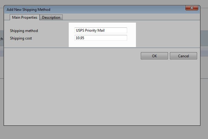 2. On the "Main Properties" tab, enter in a shipping method and then enter cost. In this example we use Priority Mail with a flat rate of $10.95. Note that with Premium Web Builder, you must put in a flat shipping rate.