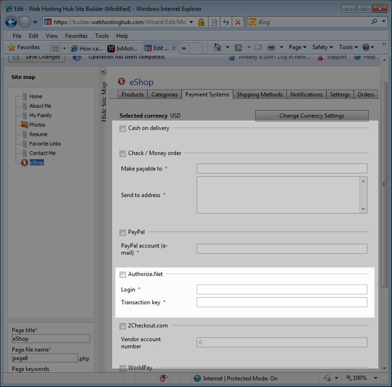 To see a list of payment options you can choose, look beneath the "Selected currency" heading within the "Payment Systems" tab. To choose a specific payment option, place a check in the check box to the left of the name and enter the required information to the right. Most payment gateways that allow your customers to pay by credit card, such as Authorize.net or BluePay, require that you have an account setup with them first. During your setup process, you'll be giving a code (sometimes referred to as a key or id). You'll need this information to complete setting up several of the payment options on this screen. If you're unsure as to what to enter, please consult with your payment gateway.