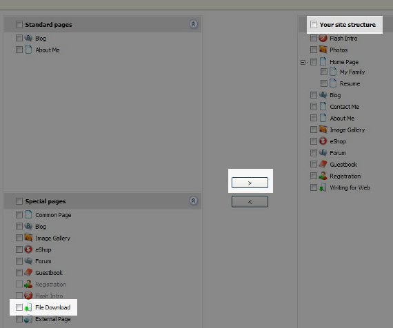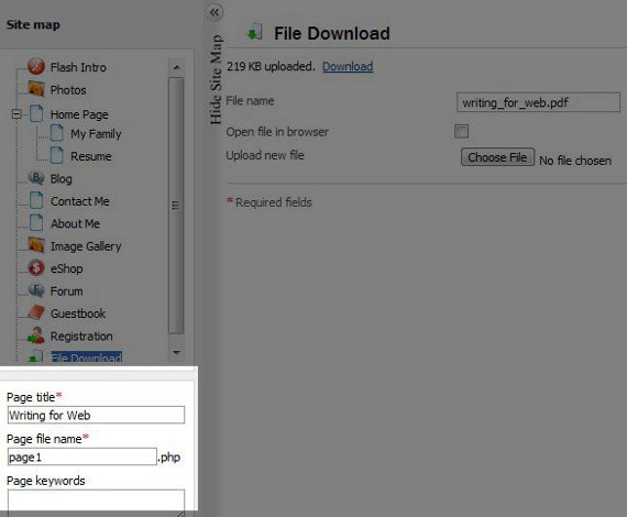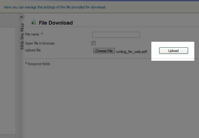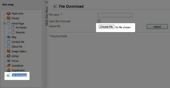 This will bring you back to your Edit Pages section, and you will see File Download on the left column under Site Map. Select it, and you will see this screen:
