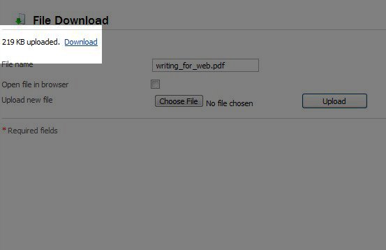 Once it shows your file as uploaded, you will want to change the title of the link to show what it is that your visitor will be downloading. By default, it says "File Download" as the Page Title on the left side of the screen. In this example I have changed it to "Writing for Web":