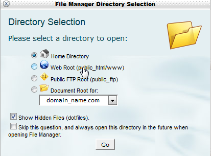 Go to the Files section and look for the File Manager. Click on the File Manager to open it. Make sure that the option for hidden files is chosen, then select Web Root and click on Go. This completes the process of removing the old website files. Note the deletion of the files is simply to make sure that there are no remnants of the old website exist that may cause possible issues when the site is republished.