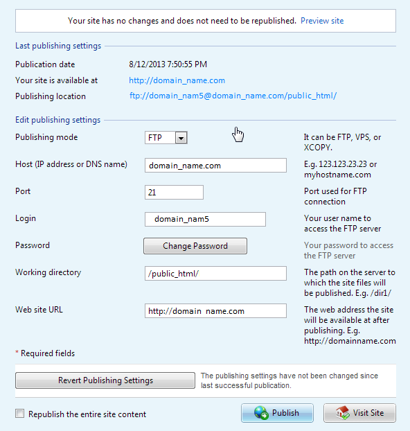 This completes the process of re-publishing your website. Make sure to check all of the links and content to make sure that the re-publishing of the site has resulted in a fully functioning copy of your original Builder-created website. See our tutorial for publishing your website if you require any further information on the publishing process.