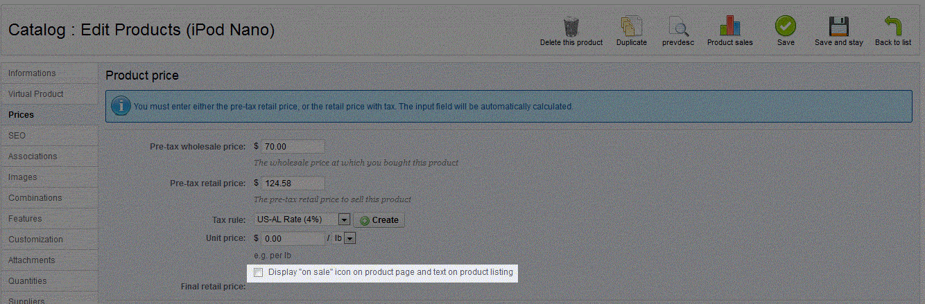 Prestashop also allows you add a graphic to show that a product is on sale. The following tutorial will show you how to add the option to indicate the product is on sale and where to find the file in PrestaShop 1.5.