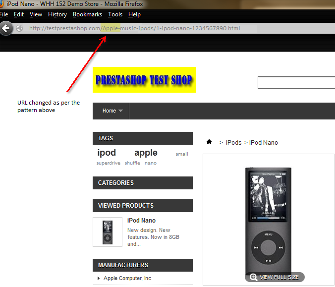 Occasionally, there is a need to have the friendly URL format changed. The owner of a shop may see the link as something that will not work for his customers or for the product that they are selling. This could also apply to the links for the manufacturer, modules or other content pages within the shop. The following screenshot shows an example of where a change may be required: