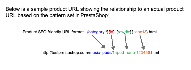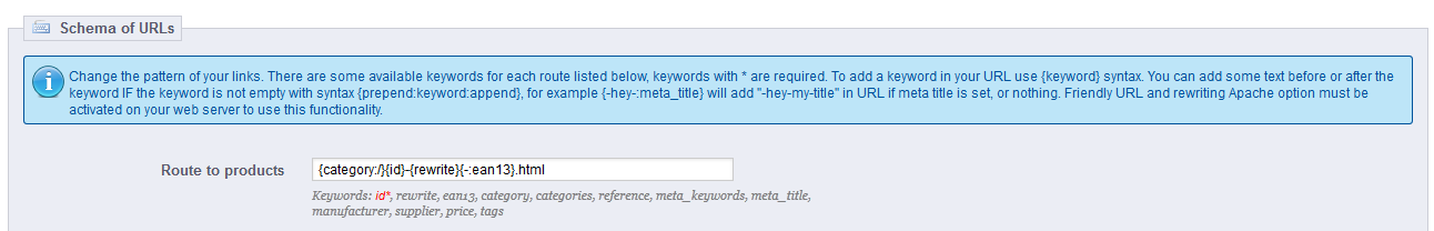 | Route to products | {category:/}{id}-{rewrite}{-:ean13}.html | *id, rewrite, ean13, category, categories, reference, meta_keywords, meta_title, manufacturer, supplier, price, tags |