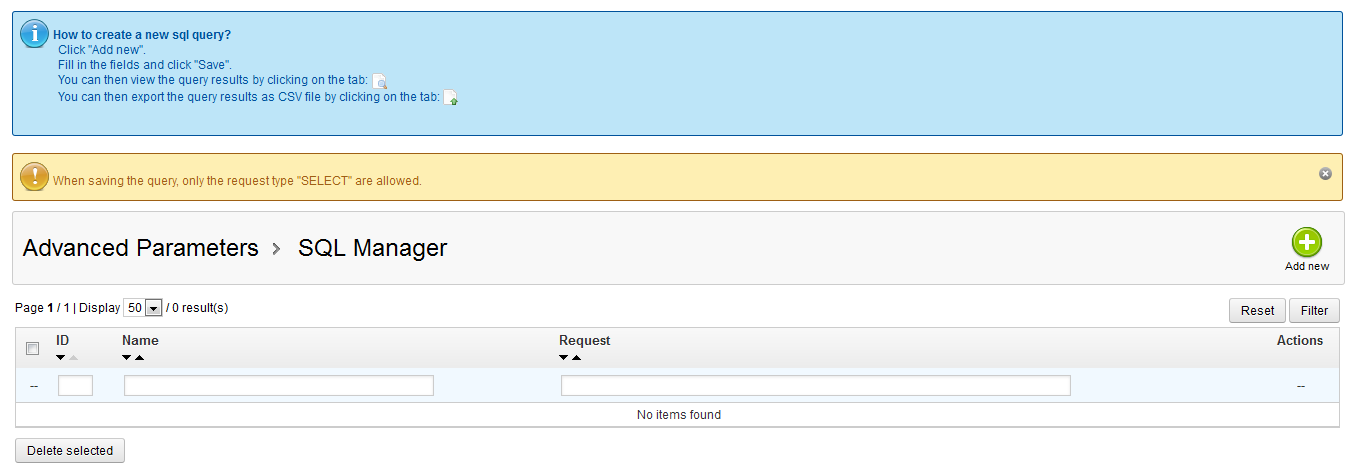 Note the blue field and the instructions. This is an information field provided by Prestashop. It gives direct instructions on how to add a new query, view the results and export the results. We will focus on simply adding query in this article.