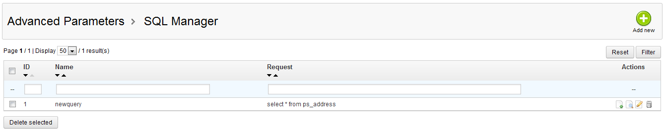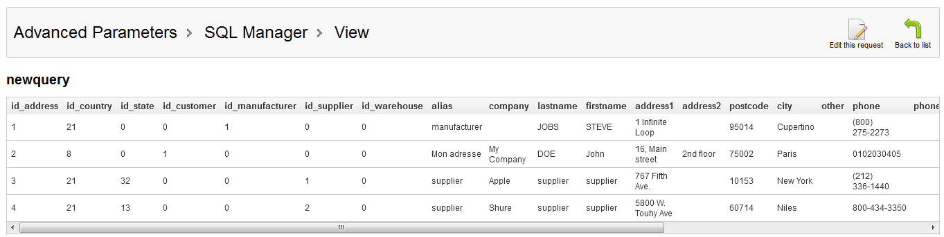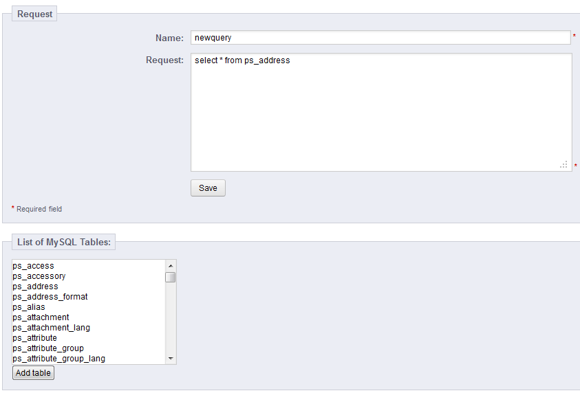 In order to add the query, simply click in the REQUEST field and type in the code. The request above is a simple select request which will show all the addresses in the PS_ADDRESS table.