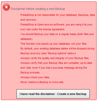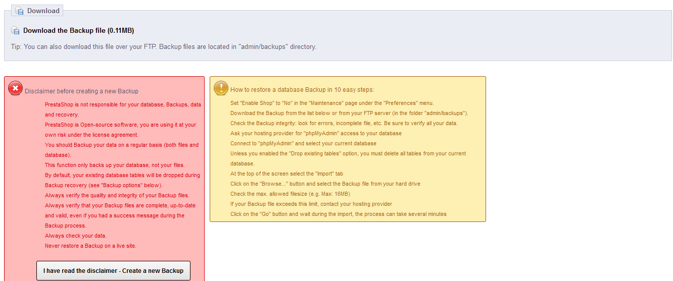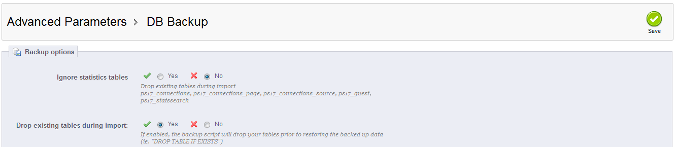 This section of of Advanced Parameters> DB Backup provides a convenient location for database backup, but it should be noted that it is only a backup for the database and not the full PrestaShop installation. The backup can be include only the store and customer data and have the statistics data removed when a backup is enacted. Use this as one of your backup options. If you other backup options that allow you to save the complete installation, then make sure to use that option as well. It will save you time and give you peace of mind.