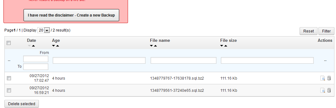 The table above lists the backups that were completed including the date, the age, file name and file size of each file. The actions column allows you to restore or delete each of these files. Remember that if you delete the file, it is permanently gone.