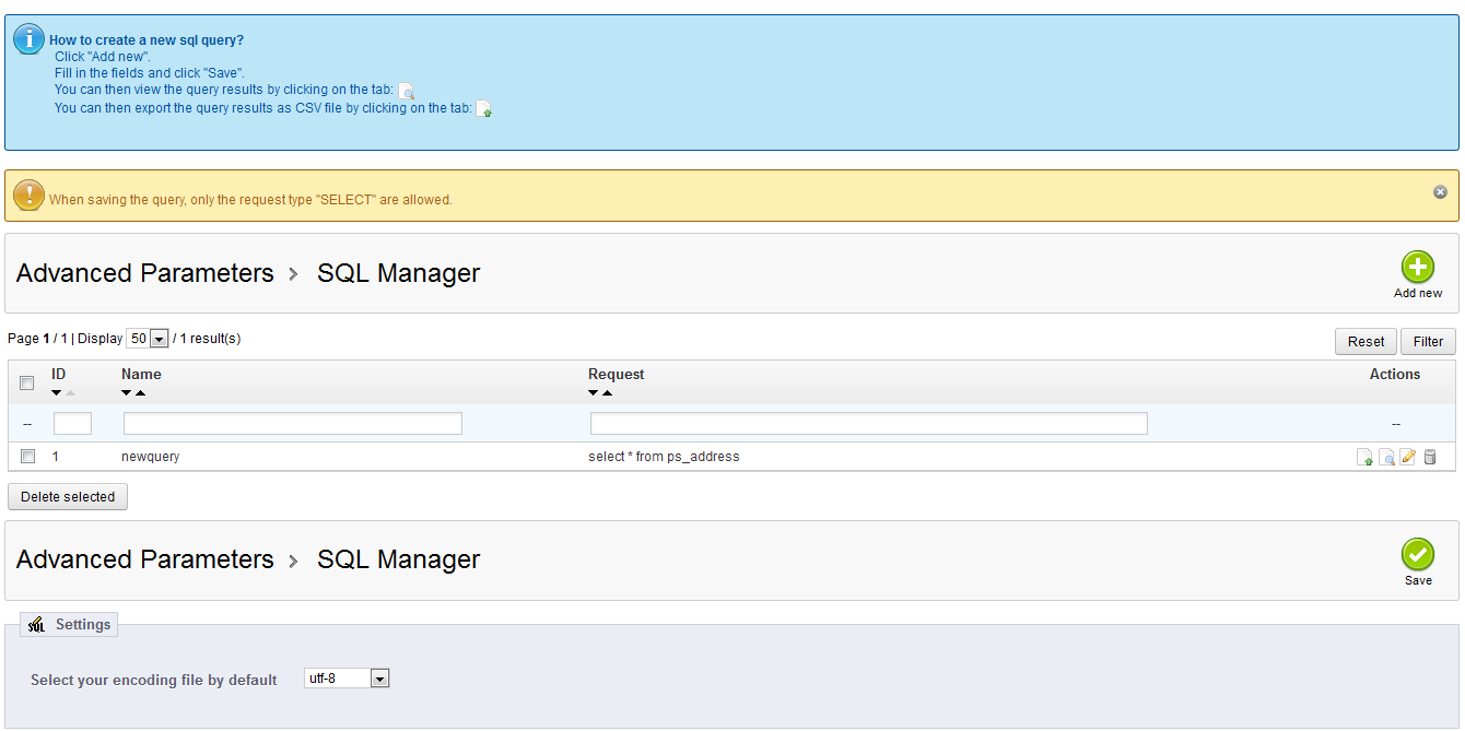 If you require a different file encoding for the results, you need to change the Settings for the query. More information for this option can be found in the Changing the Encoding Settings for SQL Manager in PrestaShop 1.5.