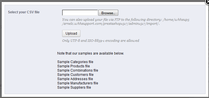 Before you can go to the next step you have to import a CSV file. Note that PrestaShop actually provides examples of the CSV files. Click on UPLOAD next to the field labeled Your CSV file (0 file):