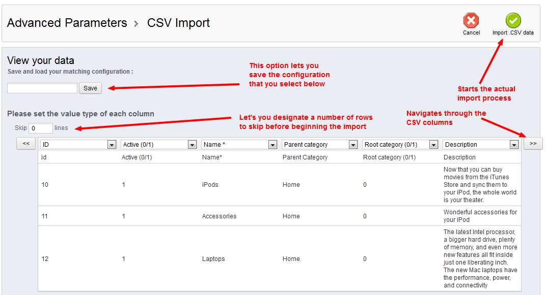 IMPORT CSV and CANCEL buttons - allows you to initiate the actual import of the data into your PrestaShop data