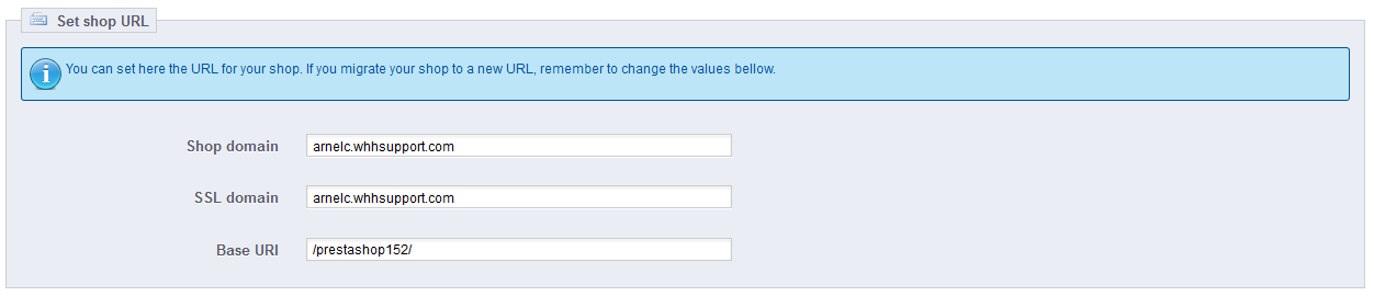Changing the URL for website is a quick process when using the built-in interface, but it can also be done directly in the database if necessary. Note that changes affect the operation of the software and should only be changed as necessary. There may sometimes be issues with the URL for the shop after this type of change. If FRIENDLY URLS (located on the same page of the Administrator dashboard as the shop URL changes described in this article) were previously set, you may need to turn this function off and save the change. Then turn it back on again after checking to make sure that the website pages were operating correctly.