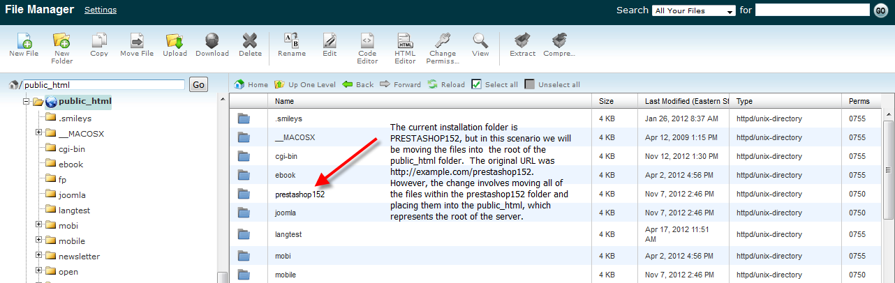 - To move the files in File Manager, you go into the prestashop152 folder, select all the files within the folder, then at the top left of the menu bar for the file manager you would select MOVE FILES. A small window will appear asking you where to move the files. You would change the destination path to simply /public_html/. Then click to proceed with the move.
