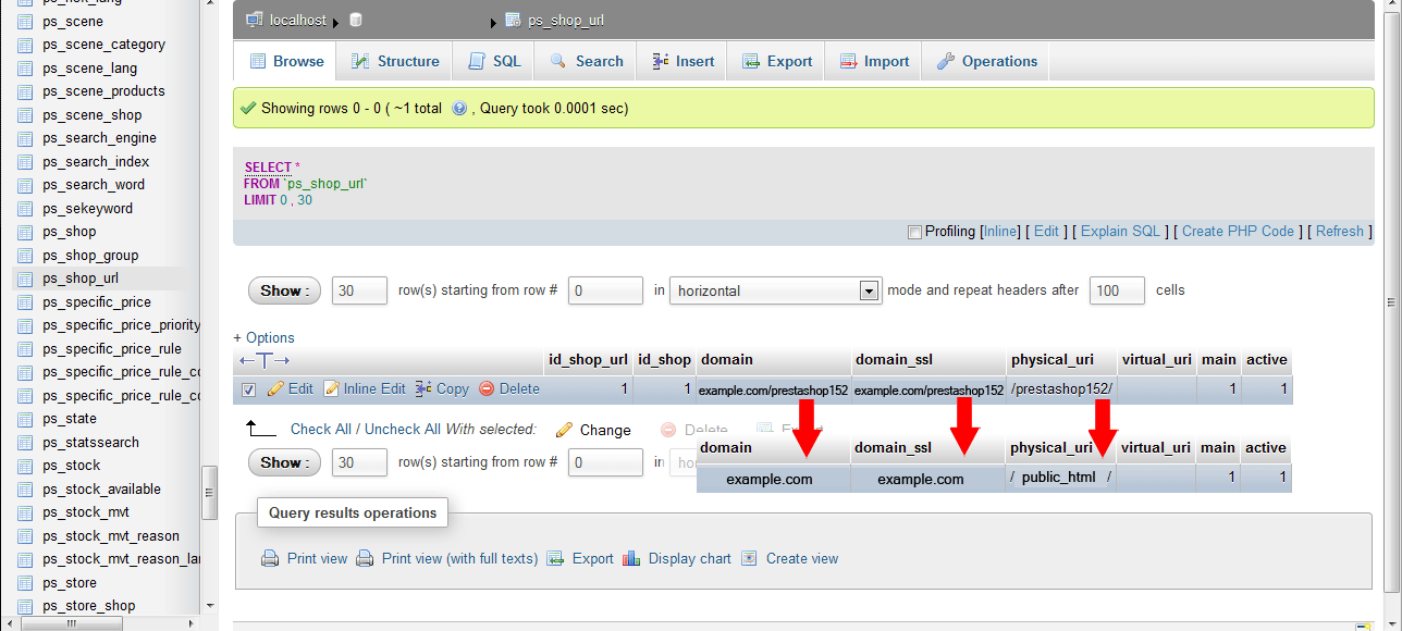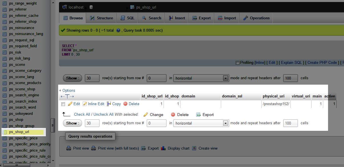Select the ps_shop_url by clicking it once, and you will see the following.