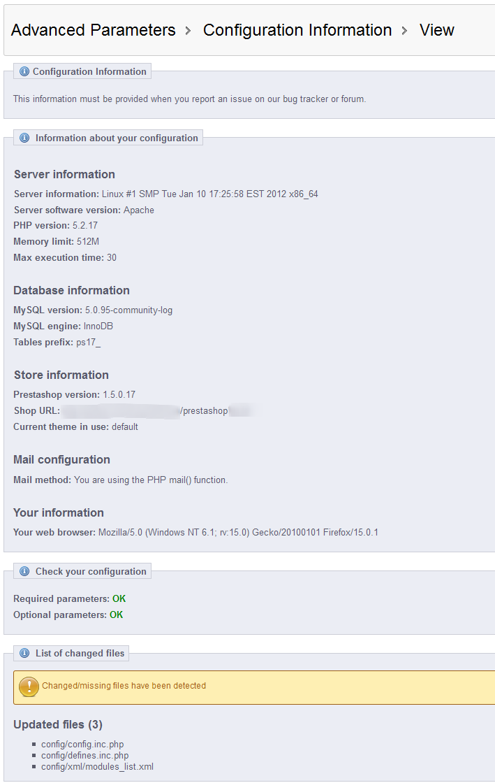 The configuration information is the listing of your server, database, mail and browser information. This information can be used to gather installation information for optimizing or upgrading your PrestaShop installation. The following article explains the different sections of the information listed by this view using PrestaShop 1.5.
