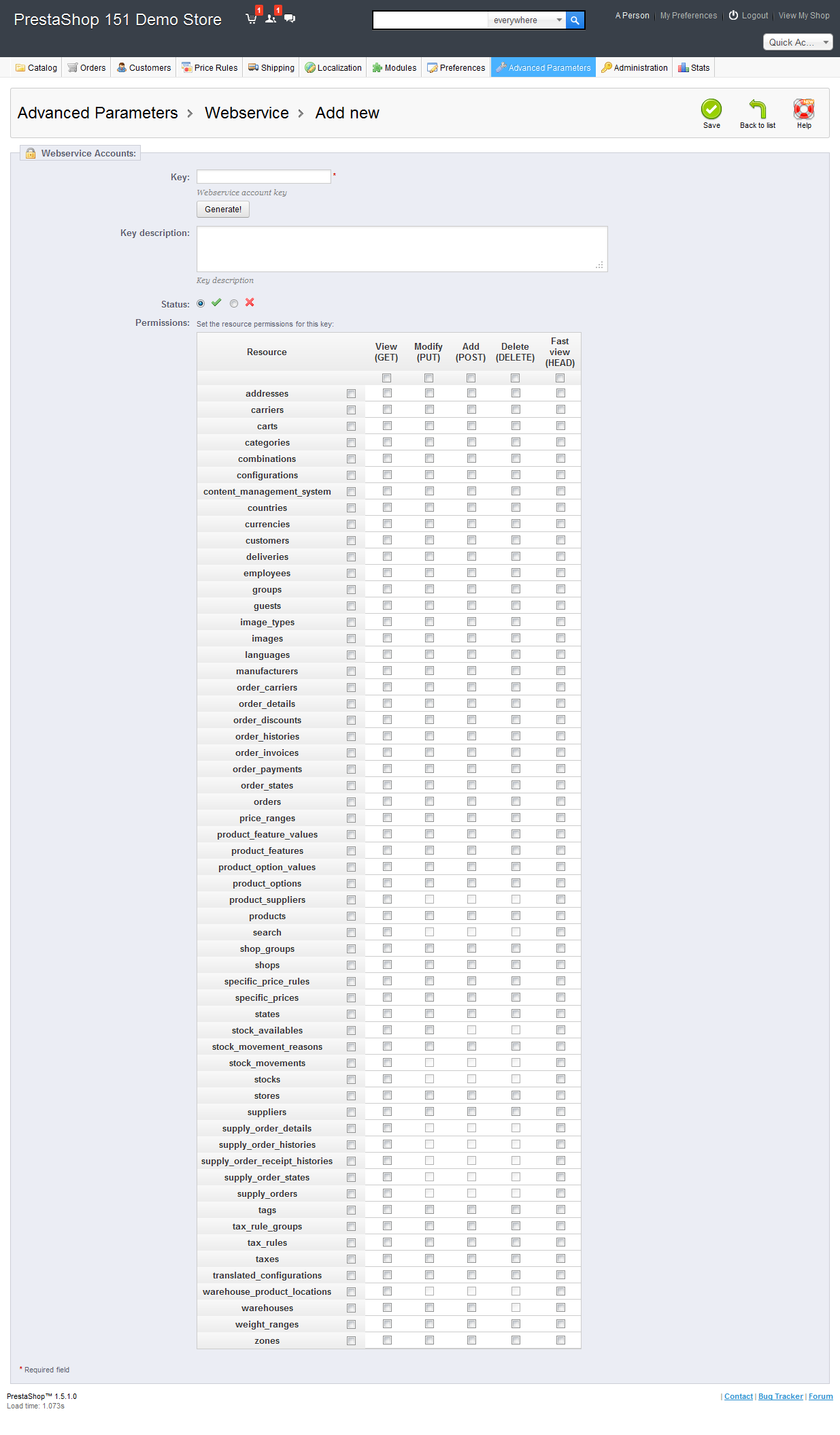 Web service in Prestashop is extremely important when you have need to share data with another person or application that may or may not reside on your server. Place careful thought when setting this service up as it opens up a possible security issue, and may impact performance on your server. For more information on setting up Web Service, go to Understanding the Prerequisites for Web Services in PrestaShop 1.5.