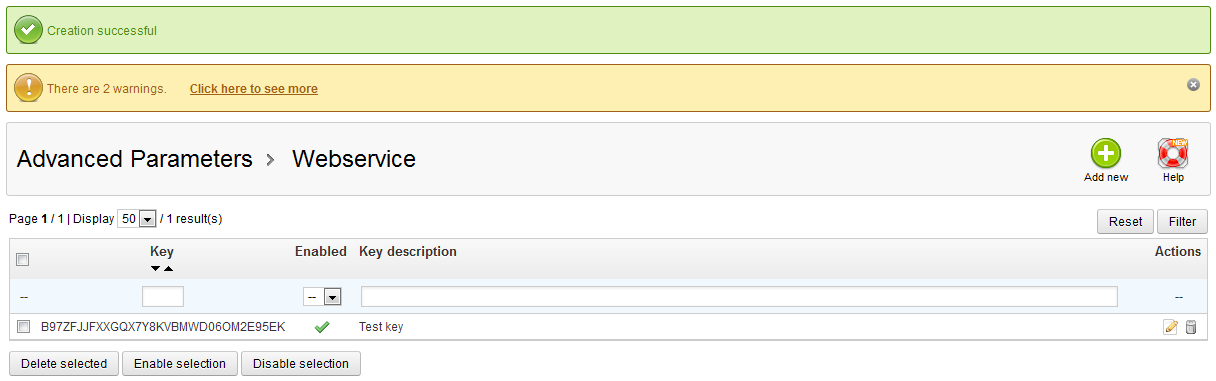 Thanks John-Paul. We can also create our own (which must be 32 characters long). But it is not good practice to do that. Prestashop simply insert this 32 chzaracters long key in to database (table : ps_webservice_account) and check every time requested key with this entry. Thanks again. |